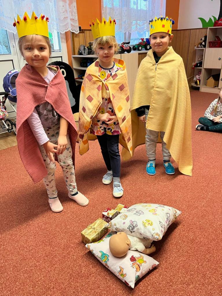 Dne 6. 1. 2023 se děti seznámily s tříkrálovou tradicí a sbírkou. Každý si vyrobil svou korunu, převlékl se do kostýmu a za zpěvu svých kamarádů se šel poklonit Ježíškovi a přinesl mu vzácné dary.