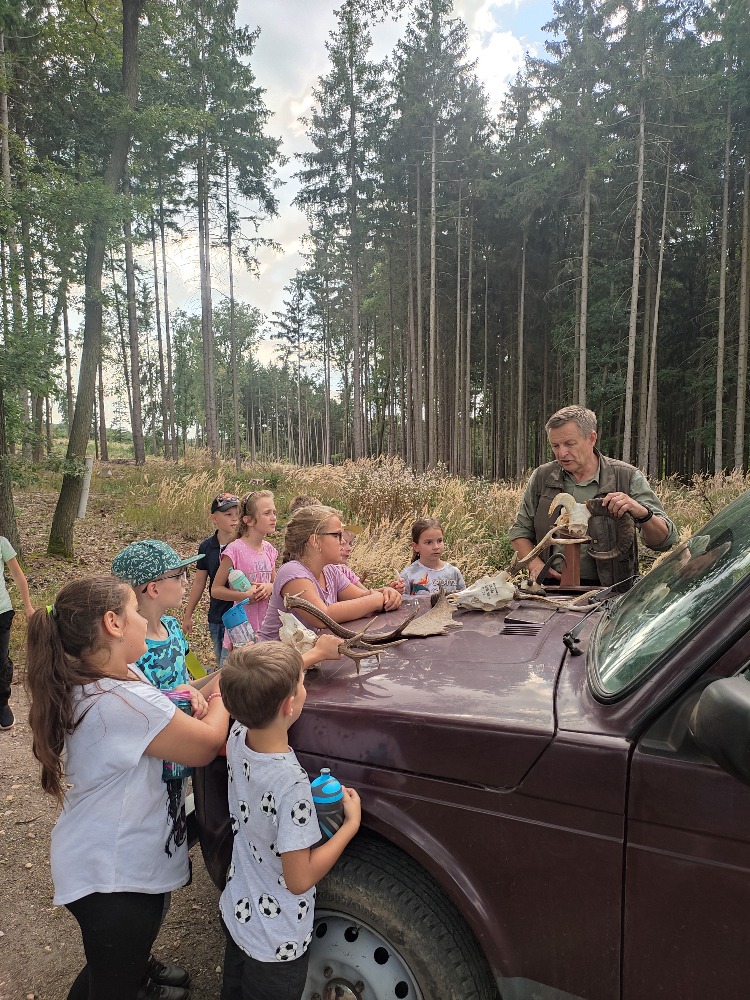 Les na podzim nám nabízí mnohé radosti a zkušenosti. Připravili jsme dětem setkání s panem Ing. Lubošem Soukupem a jeho zaměstnanci. Děti viděly jak stomům škodí kůrovec a jak se ho lesníci snaží zastavit a likvidovat. Zajímavé vyprávění děti čekalo na téma zvířata v lese, součástí byly trofeje zvířat. Zájem dětí vzbudilo kácení stomu a jeho následné odvětvení a stažení pomocí traktoru panem Jiřím Kindlem. Obdiv sklidil pan Jiří Šmída, který předvedl dětem lezení ve stromech pomocí speciální výbavy na výškové kácení. V rámci programu děti poznávaly houby, rostliny, stromy, brouky prostě vše co je v danou chvíli zaujalo.