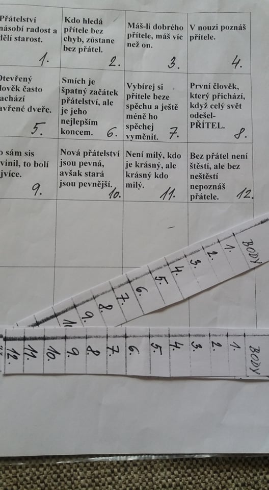 Napište si na kartičky 10 - 12 českých přísloví (najde je na internetu). Ta samá přísloví si (opište, okopírujte, ofoťte) na list papíru. Jeden hráč je zapisovatel, ten rozmístí lístečky na zahradě, dá se hrát i v místnosti. Úkolem každého hráče je najít přísloví a zapamatovat si ho. Pak běžet k zapisovateli a přísloví mu správně říct. Pokud hráč neudělá chybu, zapisovatel mu přísloví "odškrtne" jako splněné a hráč běží hledat další. Vítěz je ten, kdo najde a správně přeříká jako první všechna přísloví.