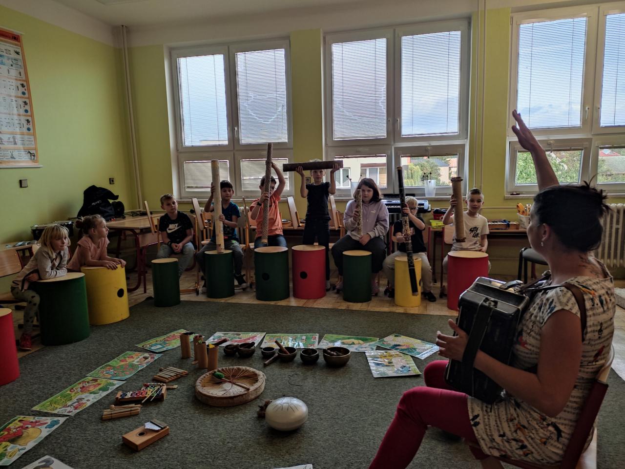 Zábavný hudební workshop zažily 4. 10. 2023 děti ve školní družině. Pod vedením Bc. Lucie Doušové si vyzkoušely hru na netradiční hudební nástroje - drumbeny (bubny), dešťové hole, zvonkohry koshi a tibetské misky. Lucie je provázela čtyřmi živly - zemí, vodou, ohněm a vzduchem, které měly návaznost na uvedené hudební nástroje a jednoduché písničky. Sama děti doprovázela hrou na harmoniku. Velký úspěch u dětí slavila hra na drumbeny, kde mohly nechat spoustu své energie.